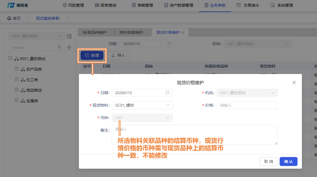 用于设置现货业务用到的基础参数,包括现货品种、现货物料(子品种)、现货每日行情价格。