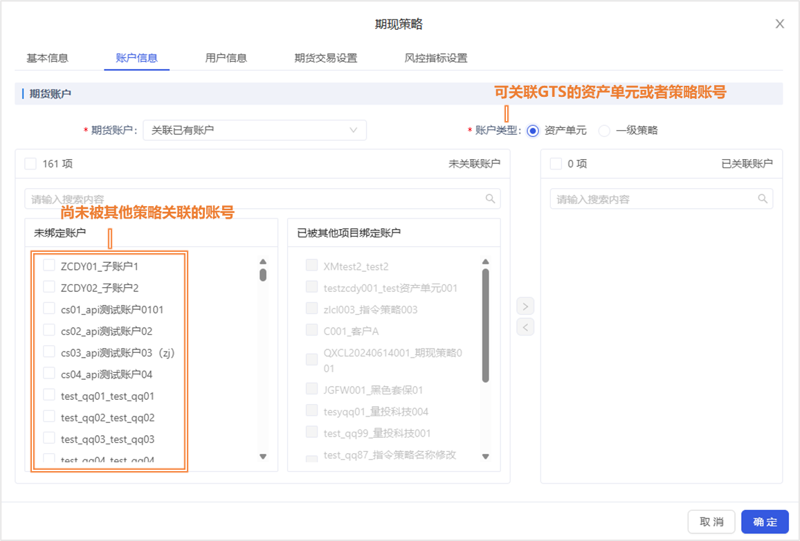 该策略在GTS期货系统已存在下单账号,可将期货下单账号关联至策略,可选择关联“资产单元”或者“ 一级策略”,仅可关联一个账号。